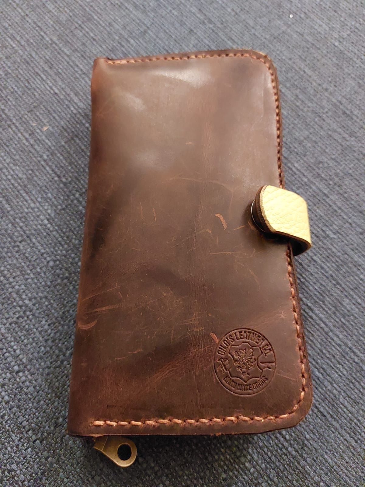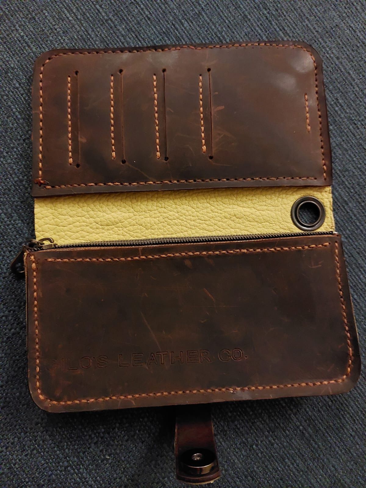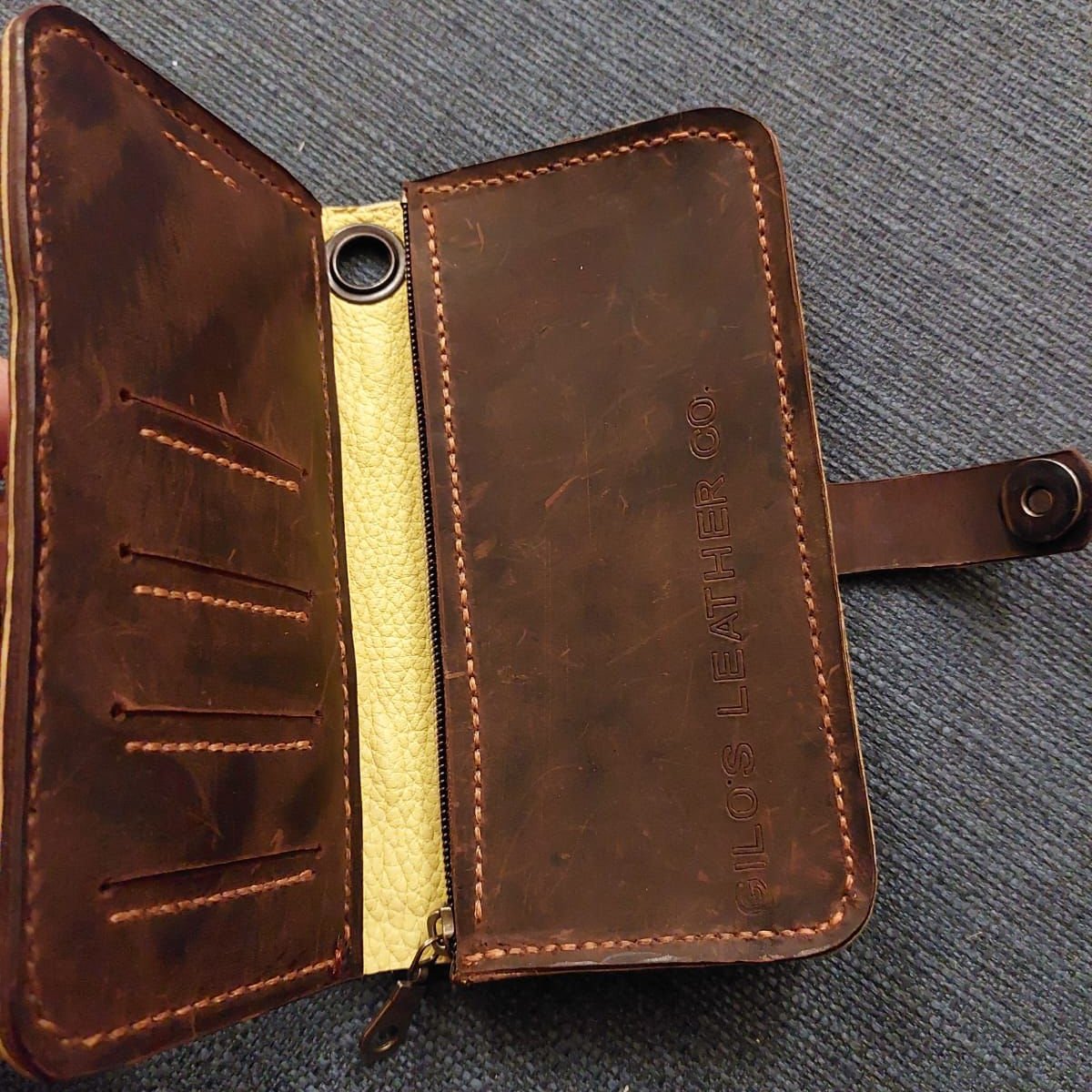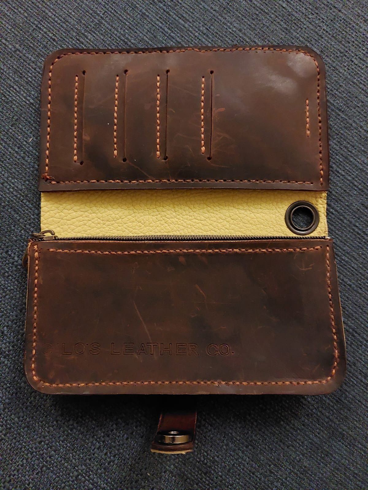 "Keep your cash and cards secure in style with this handmade leather wallet. Featuring space for cards and notes, a convenient optional chain as well as a zip close section for a cheeky pool token, it's the perfect combination of functionality and fashion. Plus, its unique design folds in half when closed for added security. Time to upgrade your wallet game!"